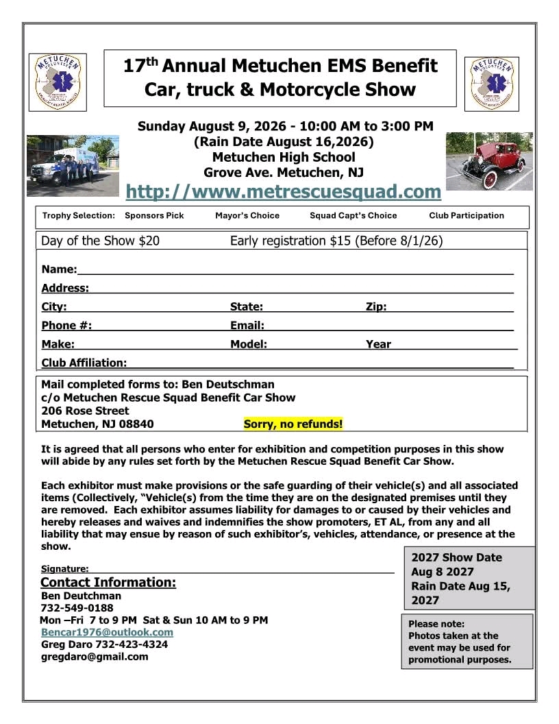Raise money through the Metuchen Rescue Squad benefit Car-Truck-Motorcycle Show via Sponsor Ads in our Show Ad Booklet, and Gate proceeds Day-Of-Show.